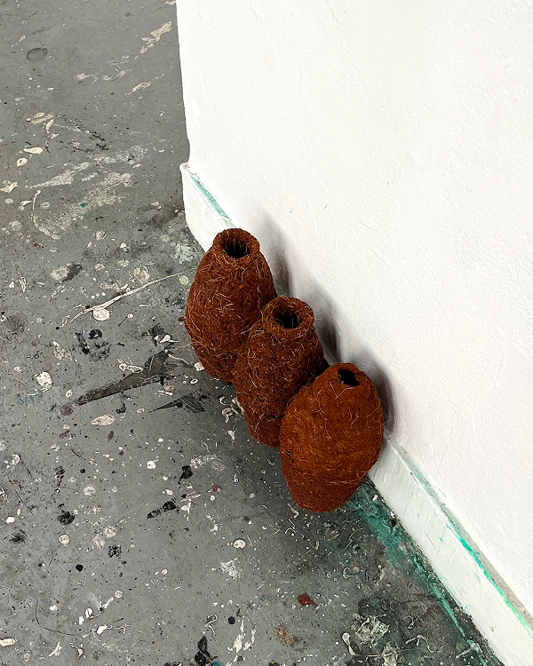 Assemblage du nid de l'insecte élaboré avec des matériaux de construction, comme par exemple, de la laine isolante recouverte de ciment. Ainsi, le naturel et l'artificiel entrent en dialogue.